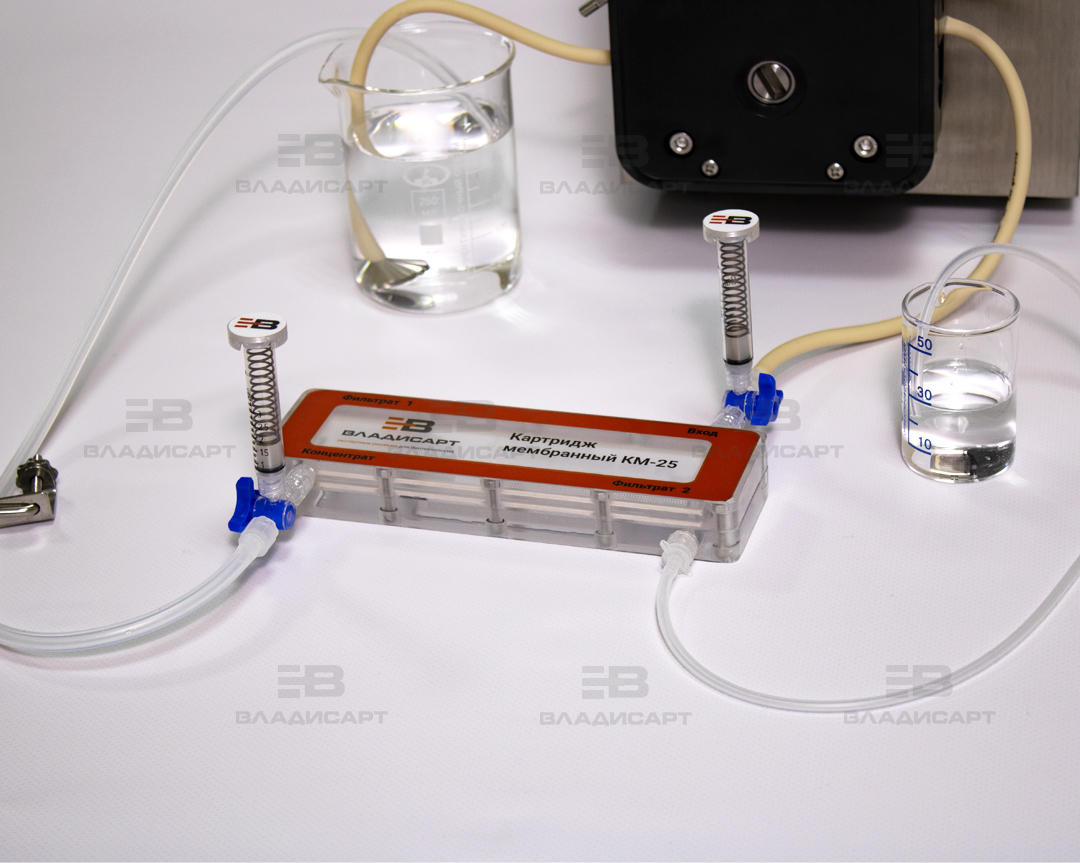 Новая разработка от АО «Владисарт» — мембранный картридж KM-25 с уникальной технологией турбулизации тангенциального потока для работы с малыми объемами растворов.