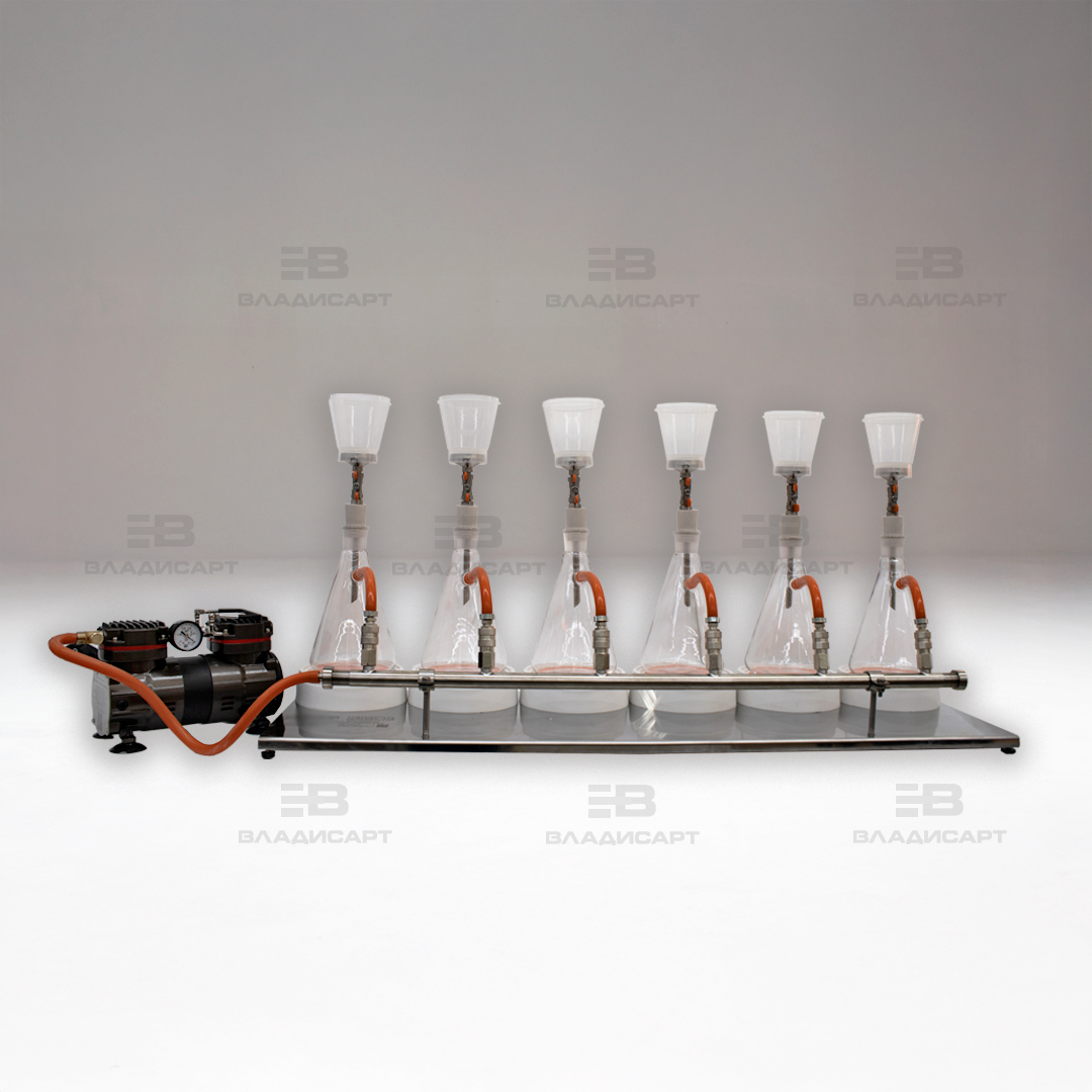 Прибор вакуумного фильтрования 6-секционный с воронками в ресивере и вакуумным насосом предназначен для проведения исследований на цветность и мутность фильтрата.
